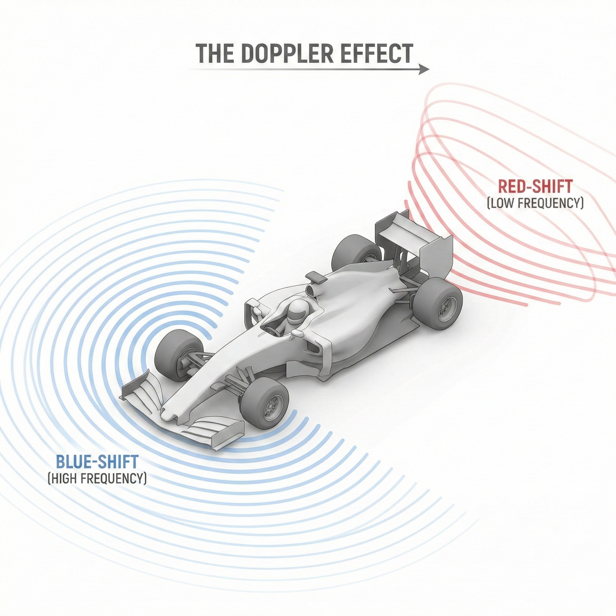 When an F1 car approaches a receiver tower at 200 mph (about 89 meters per second), the frequency of its radio transmission appears shifted upward. When it recedes, the frequency shifts downward. At 1.5 GHz, that shift is approximately 440 Hz — small, but significant enough to matter for narrow receiver filters.